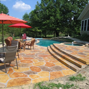 - Dallas is known for being hot and humid, making swimming pools a popular backyard addition. Stamped concrete is a great material for a pool deck because it can be poured in a variety of colors and textures, it will last for many years and is safe. If properly sealed with a UV-resistant sealer, the color of your stamped concrete will not fade in the brutal Texas sun. Furthermore, the textured surface of stamped concrete will prevent slip-and-fall accidents. For extra safety protection, an additive can be mixed with the sealer that will make the stamped concrete even more slip-resistant.